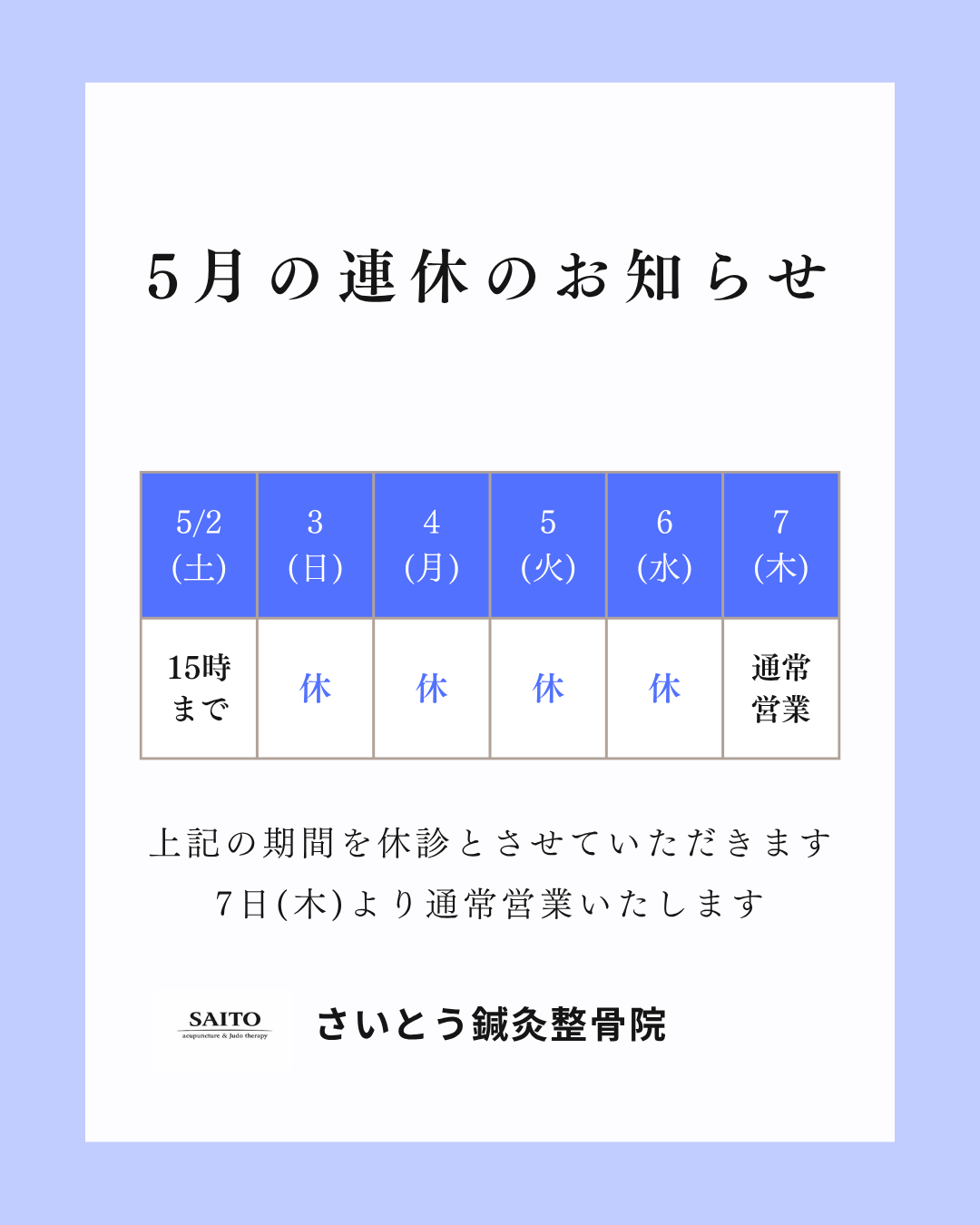 さいとう鍼灸整骨院のホームページをご覧いただき、ありがとうございます。