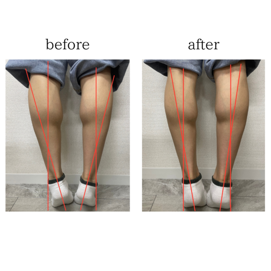 膝関節や足関節の歪みを修正し、X脚・O脚・踵の位置関係を修正していきます。