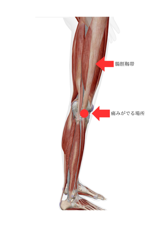 ランニングなど繰り返しの膝運動で、腸脛靭帯と大腿骨外側上顆との間で摩擦が生じ限局性の炎症がおこり、疼痛を生じる病態を腸脛靭帯炎という。