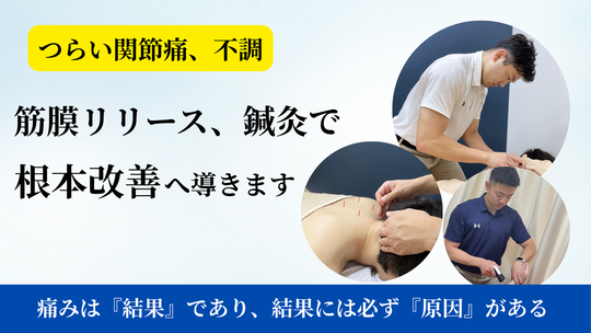 筋膜リリースとは、日常生活で生じた筋膜同士の癒着を剥がし、筋肉の柔軟性や関節の動きを作る施術方法になります。各関節が本来の位置に戻ることで、関節や筋肉の働きを正常にさせる効果が期待できます。また、痛みやシビレを引き起こしてる原因にアプローチしていく方法のため、根本改善が期待できます。