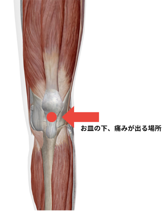 膝のお皿(膝蓋骨)の下あたりにある【膝蓋靱帯】と呼ばれる靱帯に炎症が起こるスポーツ障害です。運動習慣がない方でも発症する可能性があります・